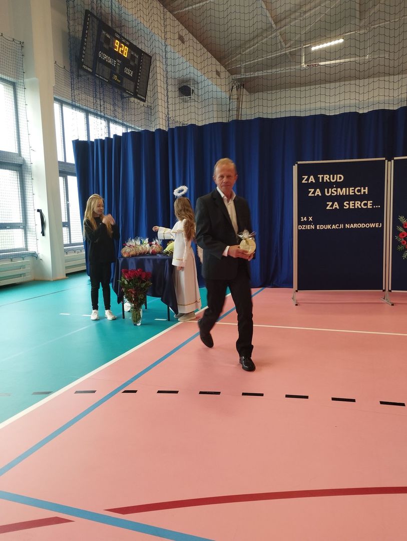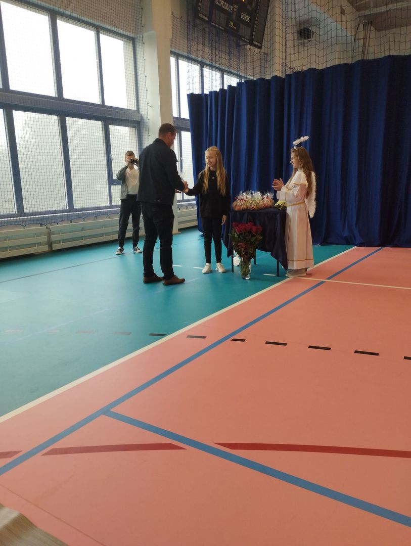 z logo naszej szkoły oraz kwiaty. Z ust uczniów padło wiele ciepłych słów, wyrażonych życzeniami.